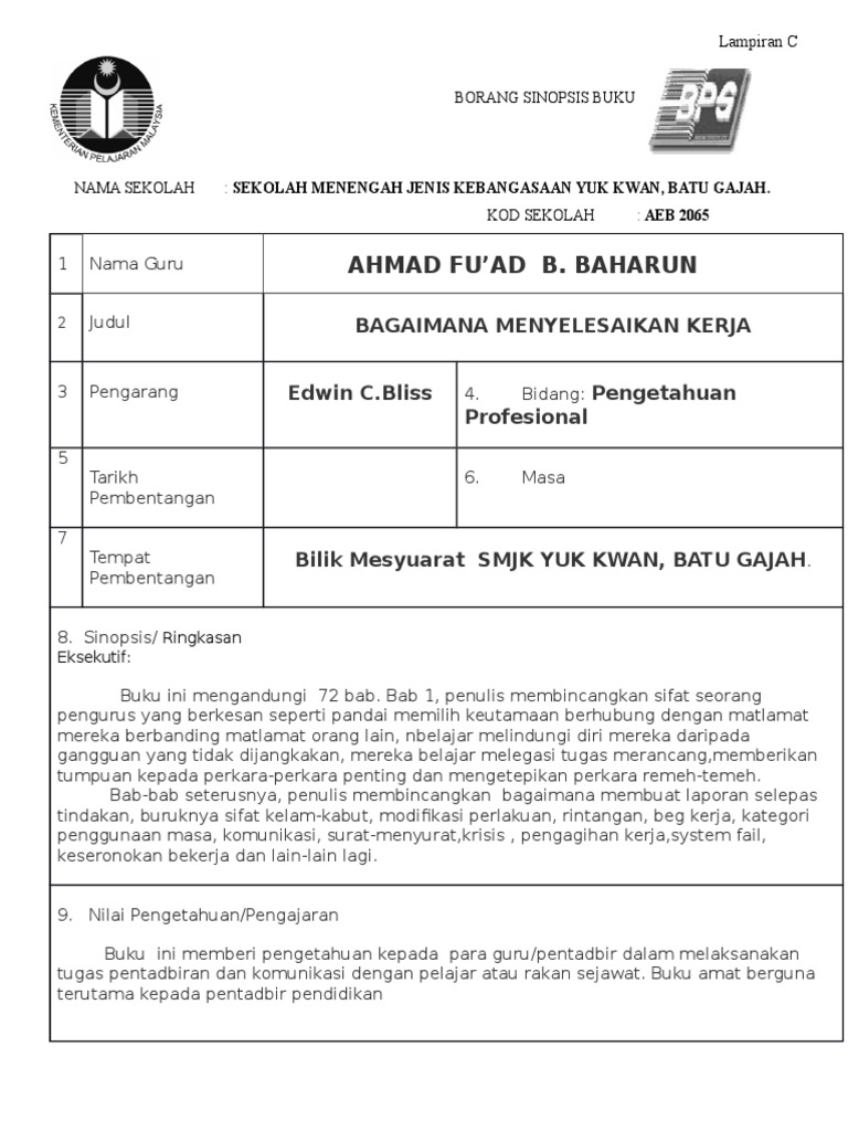 Buku ini kami tujukan untuk membantu siswa untuk dapat belajar secara mandiri dalam mempersiapkan diri sebagai generasi penerus. Lampiran C BORANG SINOPSIS BUKU. Jika ada pekerjaan lain yang sudah menunggu Anda tentu tidak mau membuang banyak waktu hanya untuk menyelesaikan pekerjaan yang itu-itu saja setiap hari.