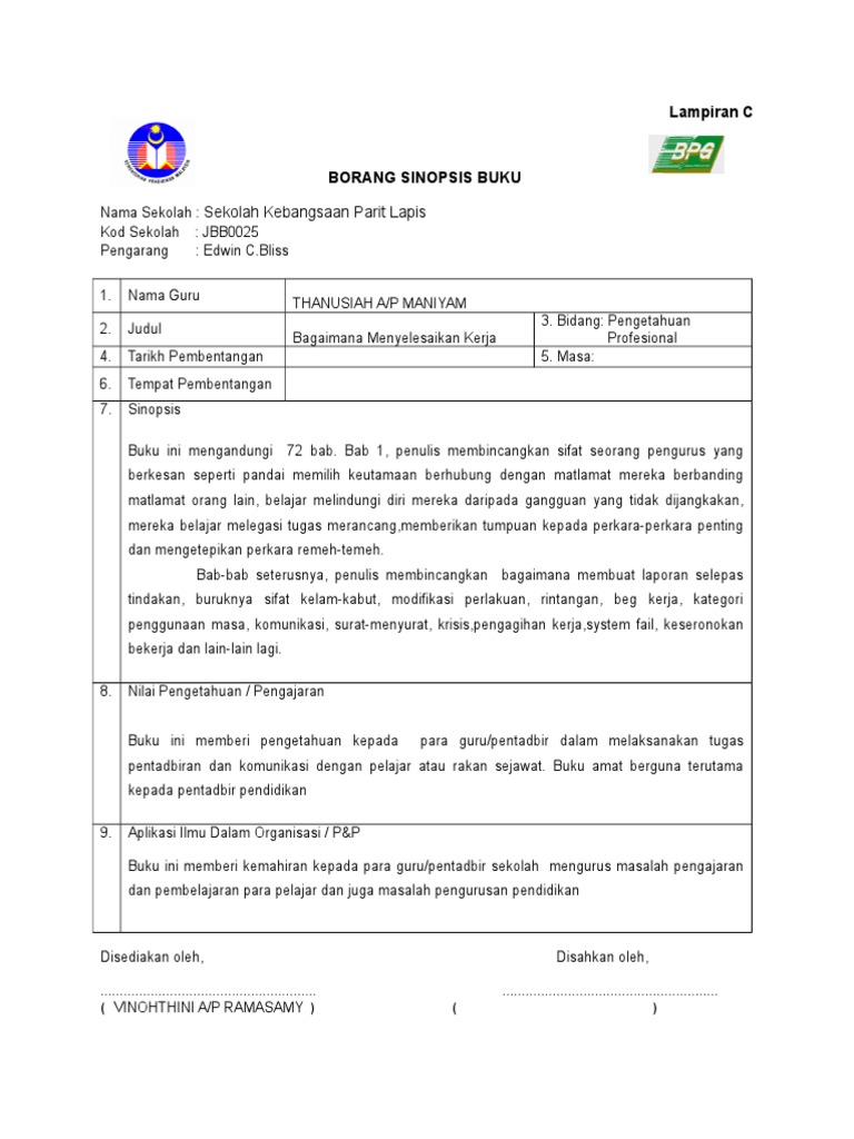 Menurut norma legislatif buku kerja bisa hanya dalam satu salinan atau jika terjadi kerusakan atau kehilangan maka bisa terjadi duplikat. Untuk kerja rumah tanpa berlaku skandal dan histeria anda harus membantu anak anda membuat rejim hari dan membiarkan dia masa untuk menyediakan pelajaran. Lampiran C BORANG SINOPSIS BUKU Nama Sekolah.